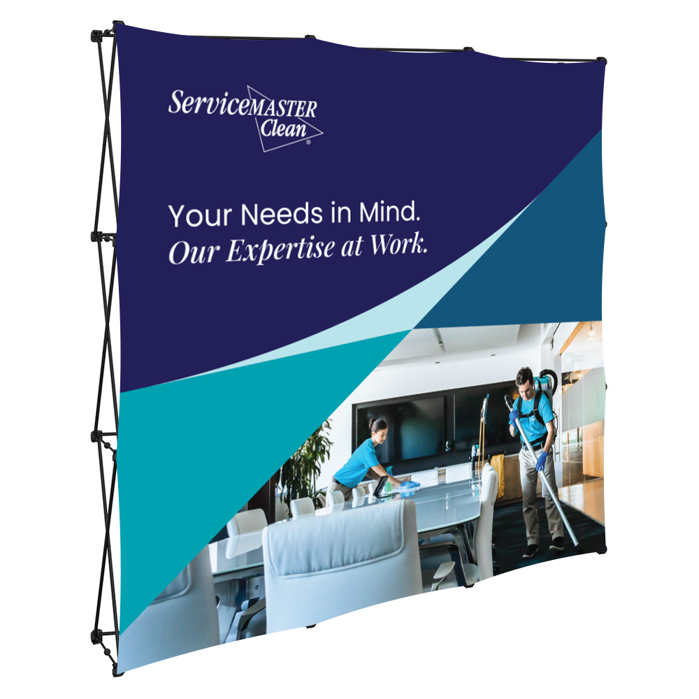 8ft Pop-up Floor Display with graphics shown. Ships with graphics attached. No tools or event labor required. Sets up quickly with strong magnetic connectors.